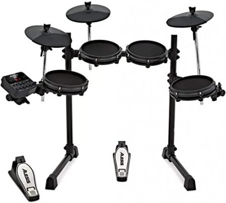 - Configuración de siete piezas: caja de malla de 8 pulgadas y (3) toms de malla de 8 pulgadas, (3) platillos de 10 pulgadas y pedales de hi-hat y kick diseñados por Alesis